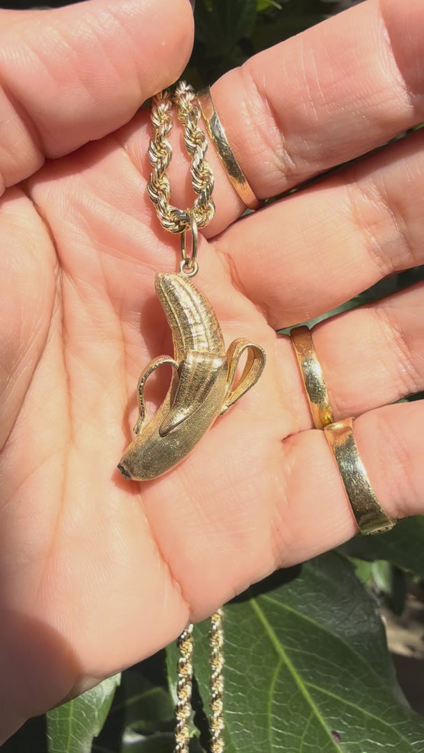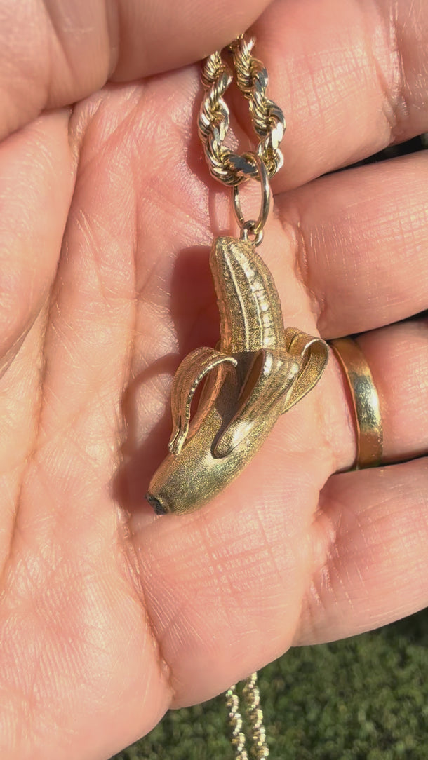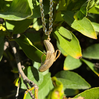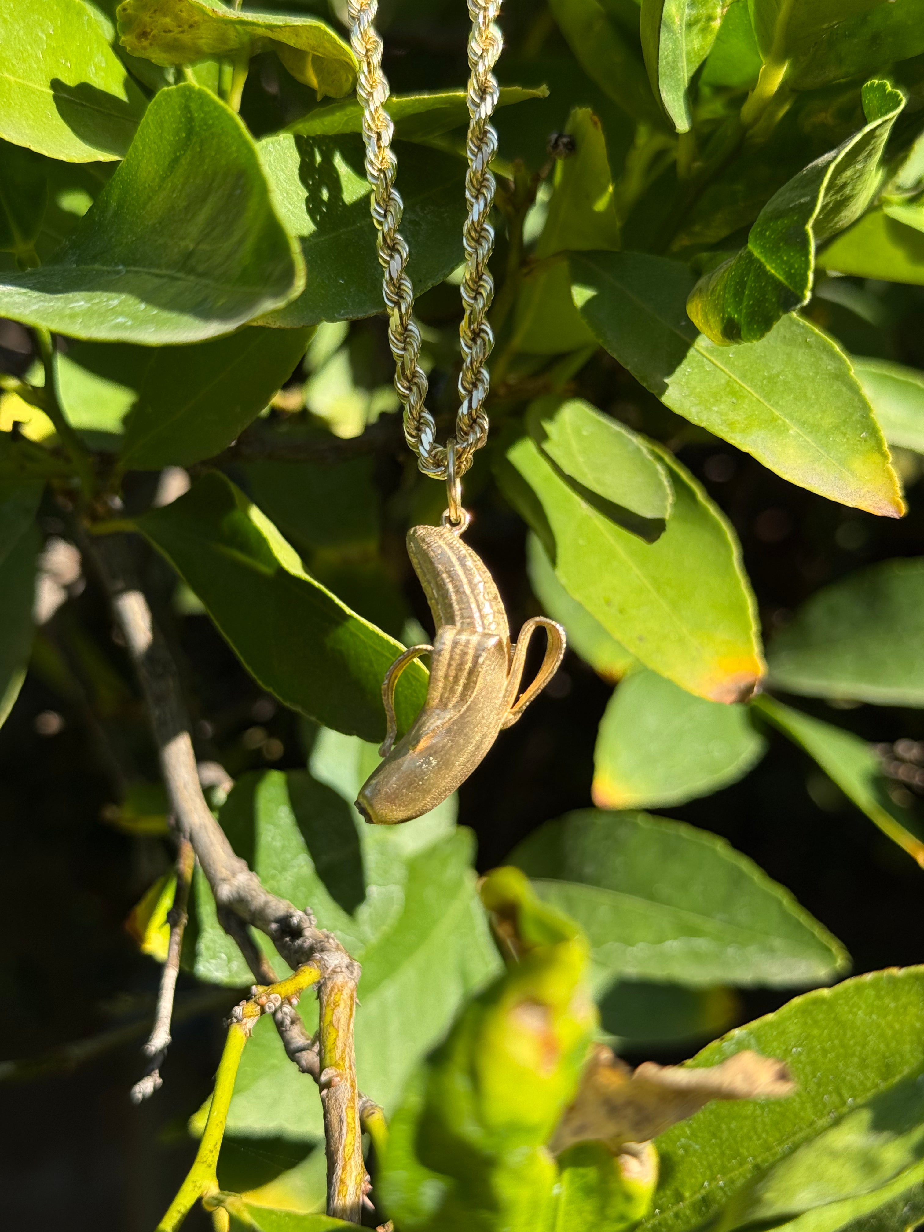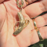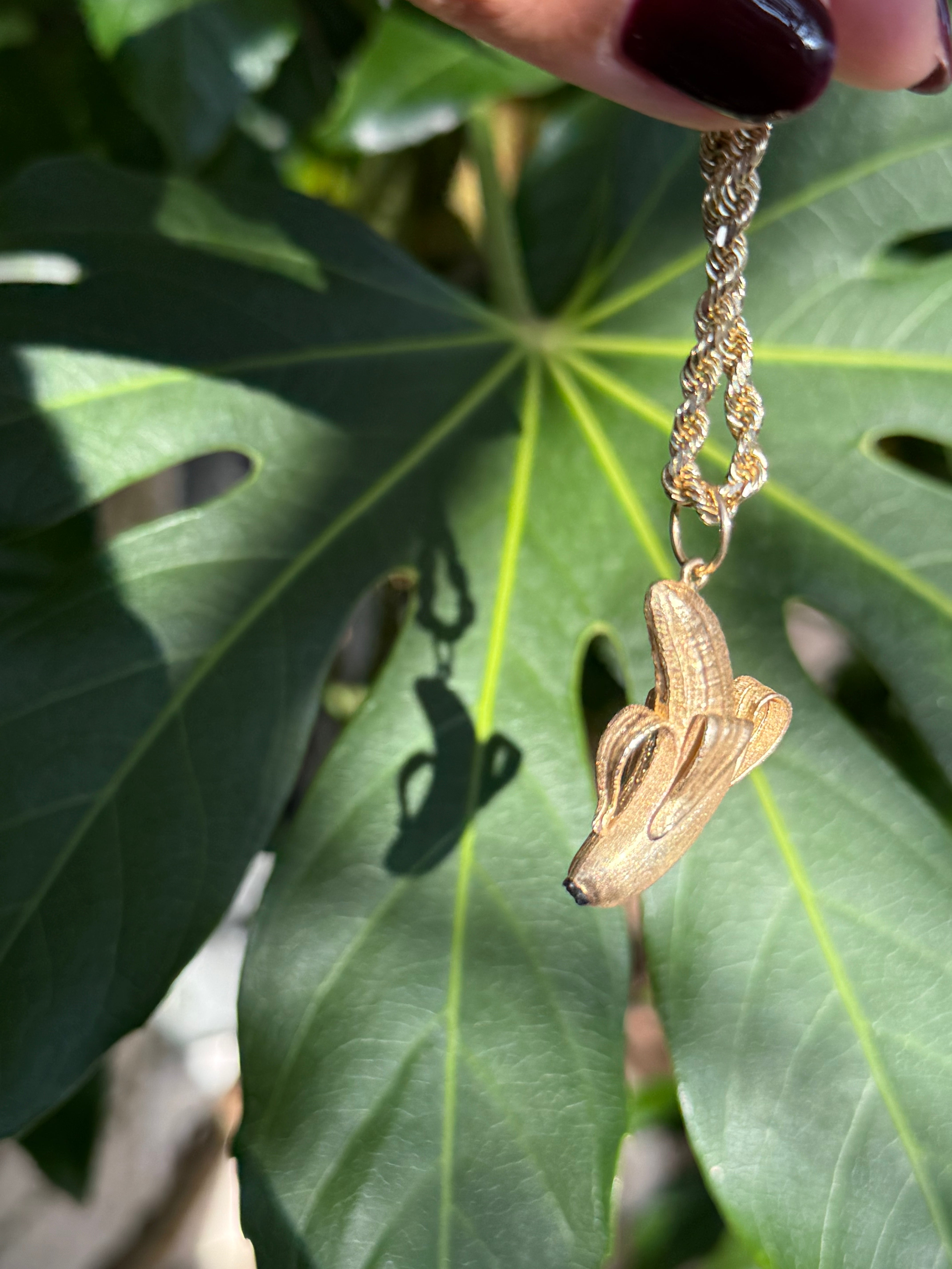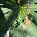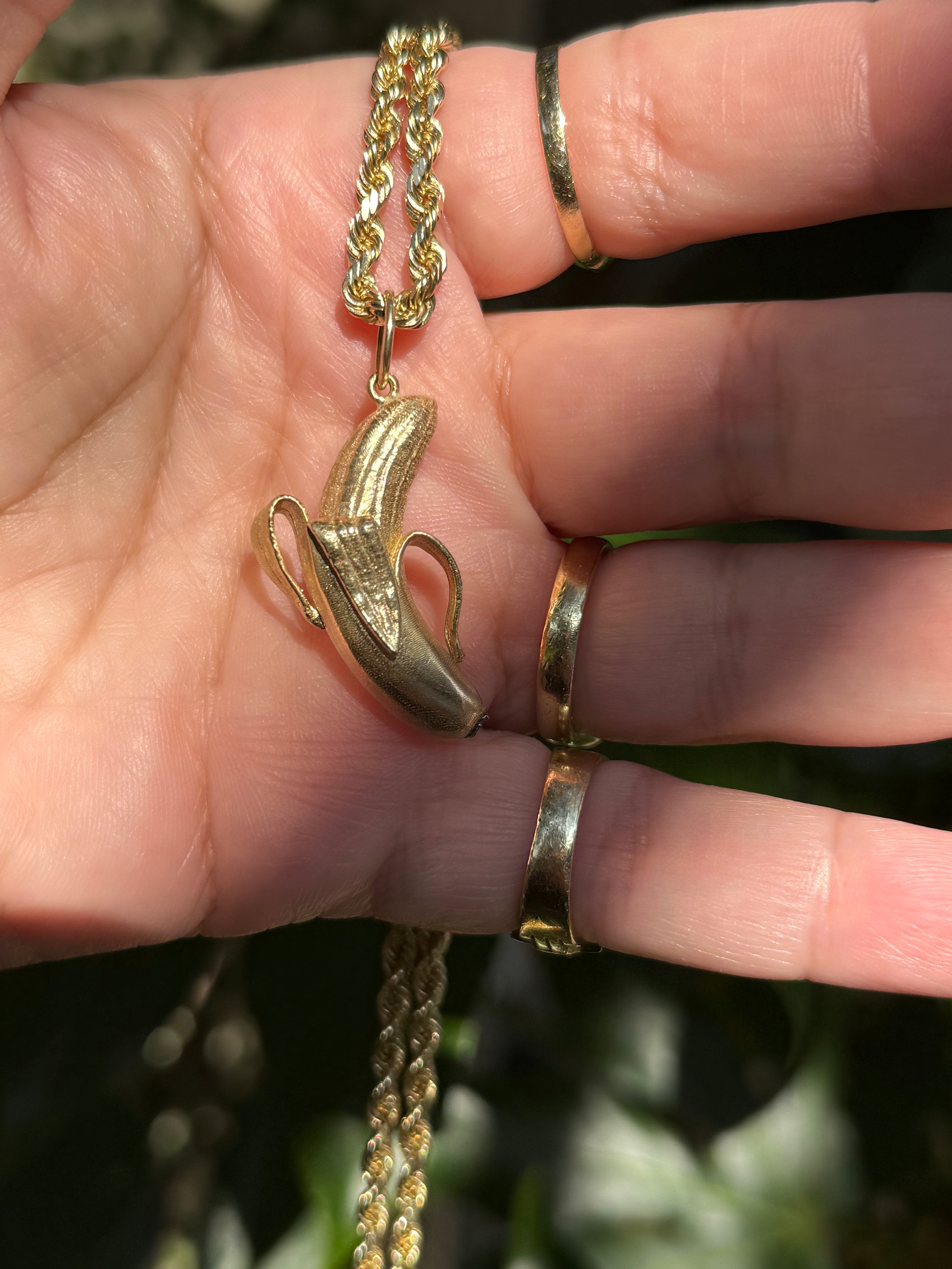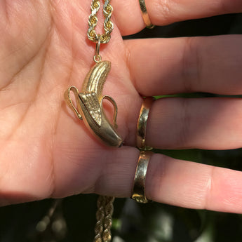 The Banana Pendant is cast in solid 14K gold and finished by hand in in Downtown Los Angeles. Its curved, three-dimensional form is sleek yet full of character — sculptural, tactile, and unmistakably DumDum.