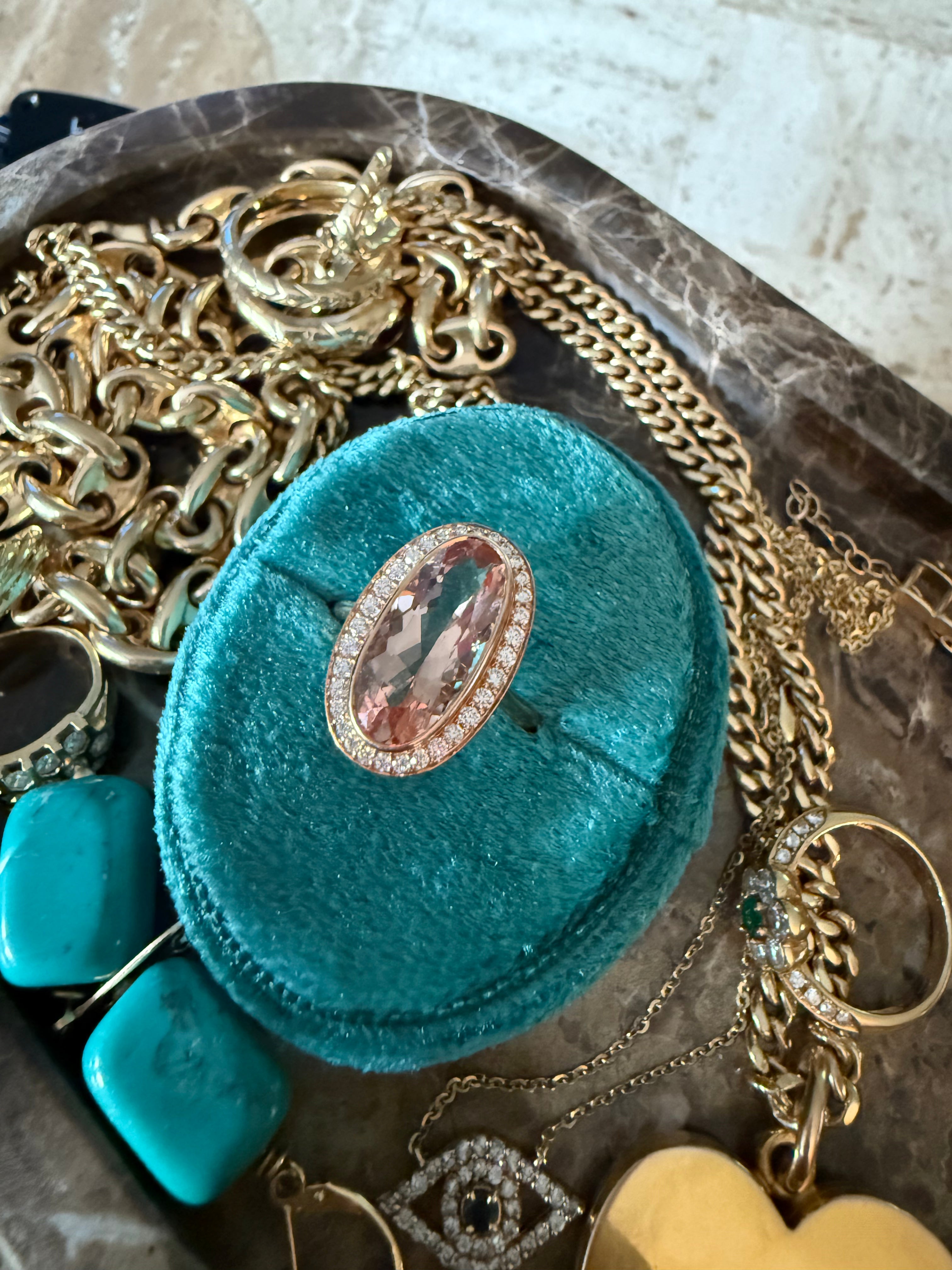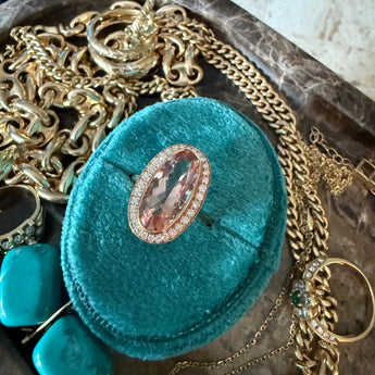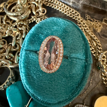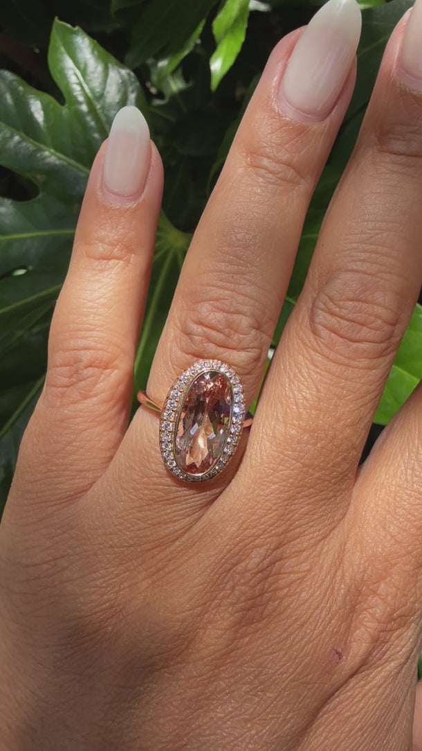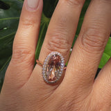 18K rose gold, bezel set oval morganite. 3.97 carats surrounded by round diamonds 0.35tcw. Size 6.75.
